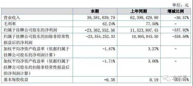 可轉(zhuǎn)過年來,公司的業(yè)績卻是“一瀉千里”。上半年,公司營業(yè)收入3958.1萬元,同比下滑36.57%,凈利直接由盈轉(zhuǎn)虧,虧損額高達(dá)2336.47萬元。