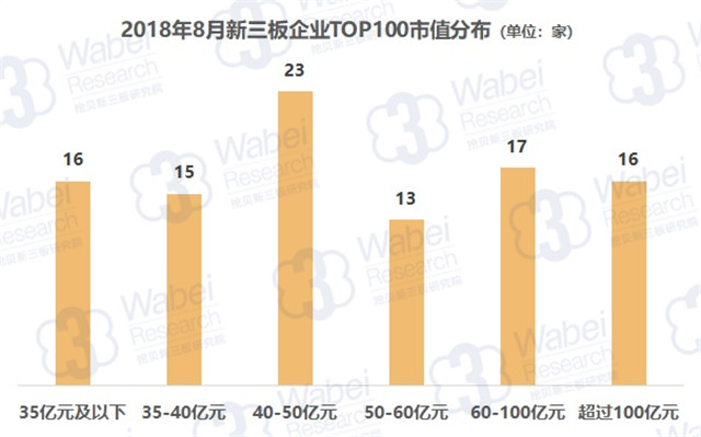 從TOP100企業(yè)的市值分布來看,市值超過100億元的企業(yè)有16家,而市值在35億元及以下、35-40億元、40-50億元、50-60億元、60-100億元的企業(yè)分別有16家、15家、23家、13家、17家。