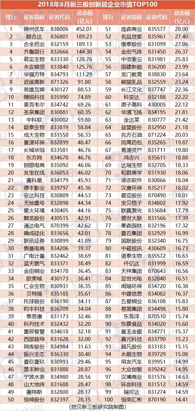 附:2018年8月全國(guó)新三板創(chuàng)新層企業(yè)市值TOP100