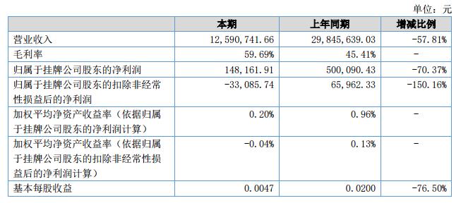 報(bào)告期內(nèi),公司營業(yè)收入為12,590,741.66元,與上年同期29,845,639.03元相比,減少了17,254,897.37元,下降了57.81%;營業(yè)成本為5,075,842.26元,比去年同期減少了11,217,353.36元,下降了68.85%;公司凈利潤為148,161.91元,與去年同期相比,減少了351,928.52元,下降了70.37%;整體毛利率為59.69%,較上年同期的45.41%有明顯上升。