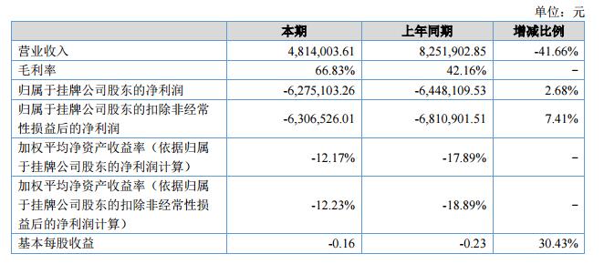 報告期內(nèi)實現(xiàn)銷售收入4,814,003.61元,比去年同期8,251,902.85元減少3,437,899.24元,較去年同期減少41.66%;營業(yè)成本1,591,010.17元,比去年同期4,772,699.30元減少3,181,689.13元,較去年同期減少66.66%;?實現(xiàn)凈利潤-6,275,103.26元,比去年同期凈利潤-6,448,109.53元增加173,006.27元,較去同期增加2.68%。?