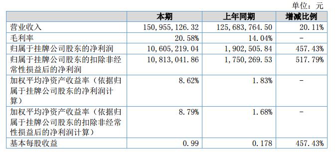 報告期內,公司實現(xiàn)營業(yè)收入150,955,126.32元,較上年同期比增長20.11%;歸屬于掛牌公司股東的凈利潤10,605,219.04元,較上年同比增長457.43%,毛利率20.58%,比上一年度大幅提高。?