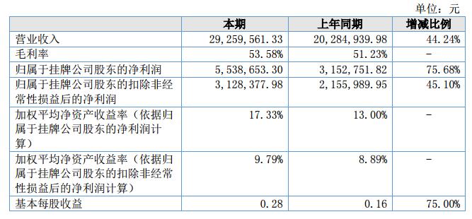 報(bào)告期內(nèi),本期營(yíng)業(yè)成本為1358.33萬(wàn)元,較上年同期上升37.31%,主要系本期公司較上年同期銷售收入上升44.24%,相應(yīng)成本增加所致;本期凈利潤(rùn)為552.74萬(wàn)元,較上年同期上升68.75%,主要原因系營(yíng)業(yè)收入大幅增加,導(dǎo)致凈利潤(rùn)也有所增加,同時(shí)獲取政府補(bǔ)貼部分同比增長(zhǎng)58.91%所致。?