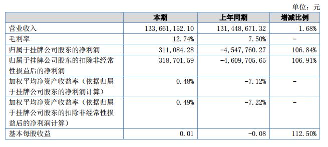 報(bào)告期內(nèi),公司實(shí)現(xiàn)營(yíng)業(yè)收入13,366.12萬(wàn)元,同比增長(zhǎng)1.68%;實(shí)現(xiàn)凈利潤(rùn)31.11萬(wàn)元,同比增長(zhǎng)106.84%;經(jīng)營(yíng)活動(dòng)產(chǎn)生的現(xiàn)金流量?jī)袅鞒鰹?85.69萬(wàn)元,凈流出減少24.01%;截止報(bào)告期末,公司總資產(chǎn)、凈資產(chǎn)分別為13,308.47萬(wàn)元、6,754.41萬(wàn)元,較上年同期分別增長(zhǎng)2.37%、0.48%。?