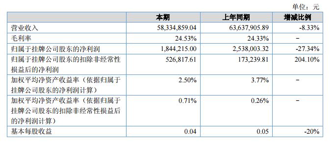 報告期內(nèi)實現(xiàn)業(yè)務(wù)收入58,334,859.04元,同比減少8.33%。凈利潤1,844,215.00元,同比減少27.34%。主要是:由于公司2018年5-6月生產(chǎn)廠房搬遷,公司生產(chǎn)處半停產(chǎn)狀,所以致收入下降。?