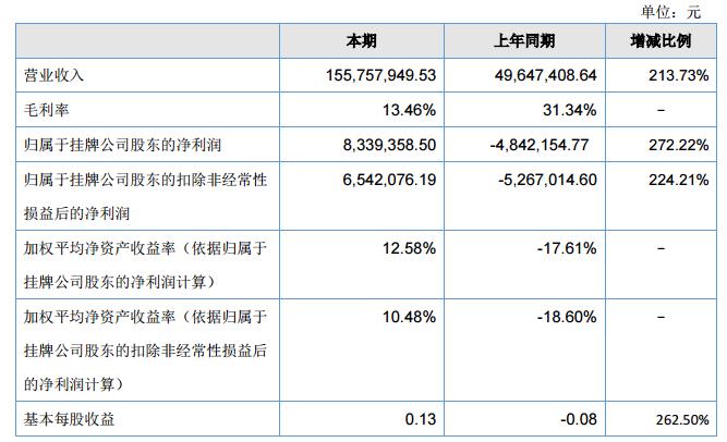 2018年上半年,公司營業(yè)收入155,757,949.53元,較去年同期增長213.73%;凈利潤7,961,568.93元,歸屬于母公司的凈利潤8,339,358.50元,凈利潤較去年同期增長259.72%。?