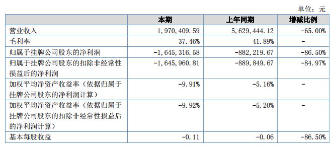 報告期內(nèi),營業(yè)收入為1,970,409.59元,同比減少了65%;毛利率為37.46%;凈利潤為-1,645,316.58元,同比減少了86.50%。?