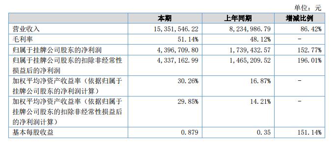 2018年上半年?duì)I業(yè)收入:15,351,546.22元;2017年上半年?duì)I業(yè)收入:8,234,986.79元,相比增長(zhǎng):86.42%;報(bào)告期內(nèi)凈利潤(rùn)4,396,709.80元;上年同期:1,739,432.57元;增減比例:152.77%。?