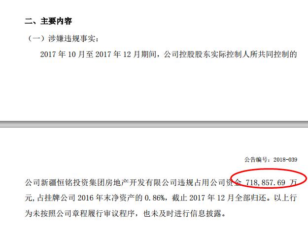 據(jù)介紹,2017年10月至2017年12月期間,公司控股股東實際控制人所共同控制的公司新疆恒銘投資集團房地產(chǎn)開發(fā)有限公司違規(guī)占用公司資金718,857.69元,占掛牌公司 2016 年末凈資產(chǎn)的 0.86%,截止 2017 年 12 月全部歸還。以上行為未按照公司章程履行審議程序,也未及時進行信息披露。