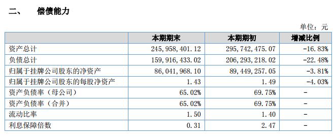 該公司近年來的年報顯示,2016年的凈資產(chǎn)89,449,257.05元,總資產(chǎn)295,742,475.07元;2017年凈資產(chǎn)86,041,968.10元,245,958,401.12元。