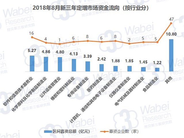 上月,新三板定增市場上,吸引資金最多的行業(yè)是軟件和信息技術服務業(yè),共募資5.27億元;其次是化學原料及化學制品制造業(yè),募資4.86億元。另外,募資金額超4億元的行業(yè)還有公共設施管理業(yè)、橡膠和塑料制品業(yè),分別募資4.80億元、4.13億元。