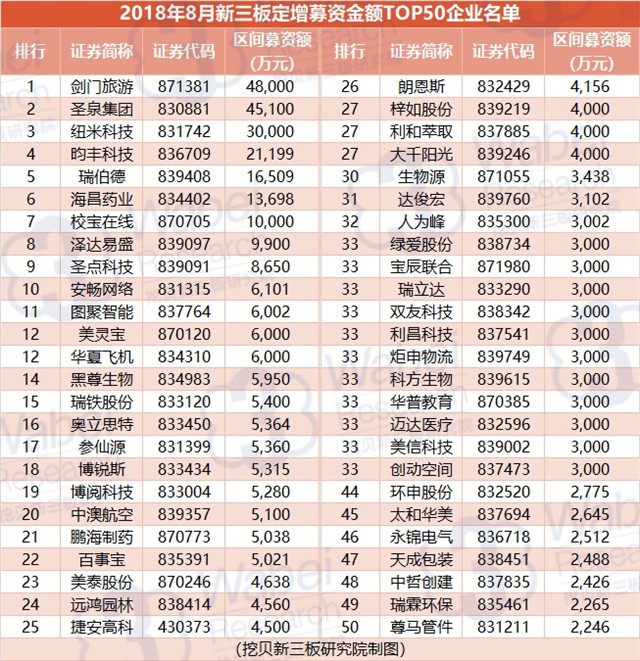 附:2018年8月新三板定增募資金額TOP50企業(yè)名單