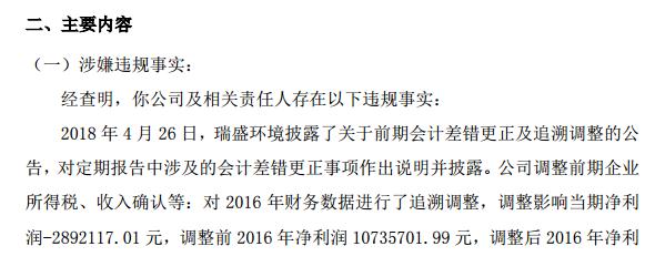 據(jù)全國股轉(zhuǎn)公司披露,經(jīng)查明,2018年4月26日瑞盛環(huán)境披露了關(guān)于前期會計差錯更正及追溯調(diào)整的公告,將2015-2016年的利潤各調(diào)低了150萬和289萬,并調(diào)整前期企業(yè)所得稅、收入確認(rèn)等。