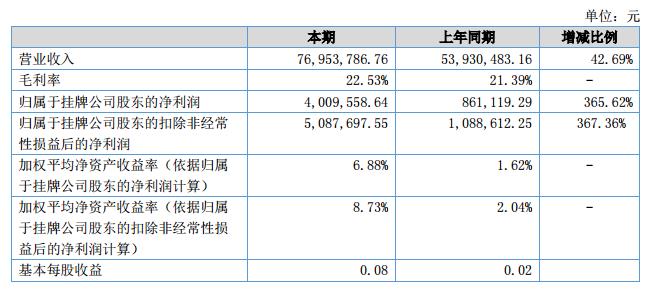 報(bào)告期期末資產(chǎn)總額13,222.59萬(wàn)元,同比增加5.05%,報(bào)告期期末負(fù)債總額7,195.70萬(wàn)元,同比增加3.37%,報(bào)告期期末凈資產(chǎn)6,026.89萬(wàn)元,同比增加7.13%,報(bào)告期內(nèi)實(shí)現(xiàn)營(yíng)業(yè)收入7,695.38萬(wàn)元,同比增長(zhǎng)42.69%,營(yíng)業(yè)成本5,961.88萬(wàn)元,同比增長(zhǎng)40.63%,報(bào)告期內(nèi)毛利率22.53%,同比增長(zhǎng)5.31%,報(bào)告期內(nèi)凈利潤(rùn)400.96萬(wàn)元,同比增長(zhǎng)365.62%。