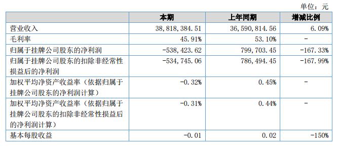 報告期內,公司實現(xiàn)營業(yè)收入3,881.84萬元,較上年同期增加222.76萬元?,增長6.09%;歸屬于母公司所有者的凈利潤-53.84萬元,較上年同期下降了167.33%。?