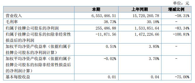 截止2018年6月30日,公司實(shí)現(xiàn)營業(yè)收入6,553,466.51元,較上年同期下降58.31%,歸屬于掛牌公司股東的凈利潤255,486.88元,較上年同期下降93.34%,歸屬于掛牌公司股東的扣除非經(jīng)常性損益后的凈利潤-11,871.56,較上年同期下降99.19%,。