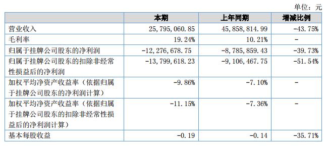 報(bào)告期內(nèi),公司實(shí)現(xiàn)營(yíng)業(yè)收入2,579.51萬(wàn)元,較上年同期減少43.75%;實(shí)現(xiàn)歸屬于公司股東的稅后凈利潤(rùn)-1,227.67萬(wàn)元,較上年同期減少39.73%。?