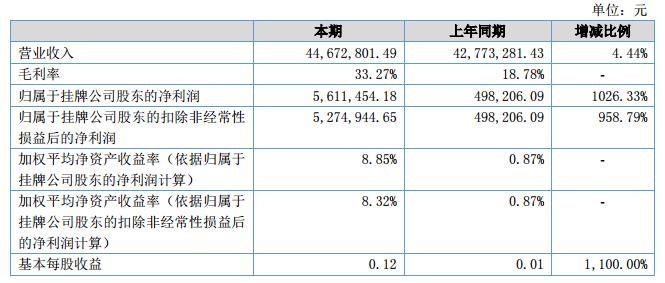 截至本期末公司資產(chǎn)總額為83,446,765.82元,較期初88,409,936.95元下降5.61%。公司本期實(shí)現(xiàn)營業(yè)收入44,672,801.49元,實(shí)現(xiàn)利潤5,611,454.18元,較上期增長1026.33%。報告期內(nèi)公司加大非標(biāo)產(chǎn)品的投入力度,提升公司總體毛利率,提升管理水平控制費(fèi)用支出,實(shí)現(xiàn)利潤的大幅提升。?