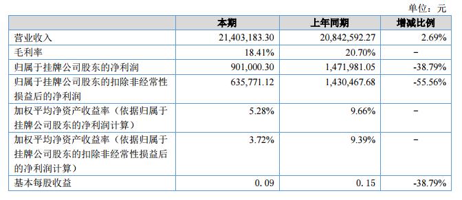 報告期內(nèi)公司營業(yè)收入2,140.32萬元,比上年同期上升2.69%,營業(yè)成本1,746.37萬元,比上年同期上升5.65%,凈利潤90.10萬元,比上年同期下降38.79%。?