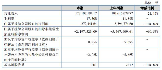 報告期內(nèi),公司上半年實(shí)現(xiàn)營業(yè)收入12,310.72萬元,較上年同期增長21.15%;公司凈利潤為27.24萬元,較上年同期上升104.84%。?