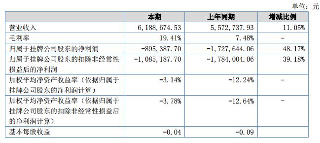 報(bào)告期內(nèi),公司實(shí)現(xiàn)營(yíng)業(yè)收入6,188,674.53元,比上年同期增長(zhǎng)11.05%;結(jié)轉(zhuǎn)營(yíng)業(yè)成本4,987,211.25元,較上年下降3.27%;實(shí)現(xiàn)凈利潤(rùn)-895,387.70元,比上年同期增長(zhǎng)48.17%。?