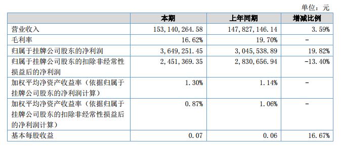報(bào)告期內(nèi),2018年上半年實(shí)現(xiàn)營(yíng)業(yè)收入15,314.03萬元,營(yíng)業(yè)收入相比去年同期增長(zhǎng)3.59%;凈利潤(rùn)為352.64萬元,較去年同期增加16.83%。?