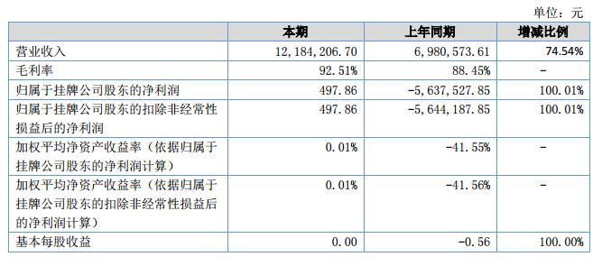 報告期內(nèi),公司實(shí)現(xiàn)營業(yè)收入1,218.42萬元,比上年同期增長74.54%。2018年上半年,企業(yè)實(shí)現(xiàn)歸屬于掛牌公司股東的凈利潤為0.05萬元,比上年同期增長100.01%;截至2018年6月30日,公司注冊資本1,000萬元,資產(chǎn)總額為368.64萬元,負(fù)債總額732.29萬元,凈資產(chǎn)-363.65萬元。?