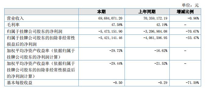 公司在報告期內(nèi)的主營業(yè)務(wù)收入69,684,071.20元,同比減少0.96%;營業(yè)成本為36,529,907.78元,同比減少10.18%;凈利潤為-5,473,151.90元,同比上期減少了70.67%。截止2018年6月30日,資產(chǎn)總額為43,194,517.69元,負(fù)債總額為27,515,466.57元,所有者權(quán)益合計為15,679,051.12元。?