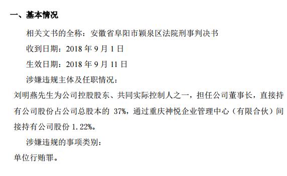 相關(guān)公告顯示,2004年至2013年,劉明燕在安徽省所投資燃?xì)忭?xiàng)目的單位行賄。依據(jù)相關(guān)法律,判罰刑期1年(判決執(zhí)行以前先行羈押的,羈押一日折抵刑期 一日,即從 2017 年 9 月 2 日到 2018 年 9 月 1 日),并判處罰金人民幣 20 萬(wàn)元。