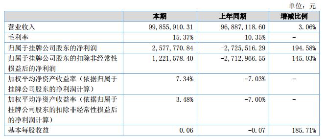 報(bào)告期內(nèi),公司的營(yíng)業(yè)總收入為9,985.59萬(wàn)元,較上年同期的9,688.71萬(wàn)元上升3.06%;營(yíng)業(yè)總成本為9,813.56萬(wàn)元,較上年同期的9,910.16萬(wàn)元下降0.97%;利潤(rùn)總額為356.07萬(wàn)元,凈利潤(rùn)257.78萬(wàn)元。?