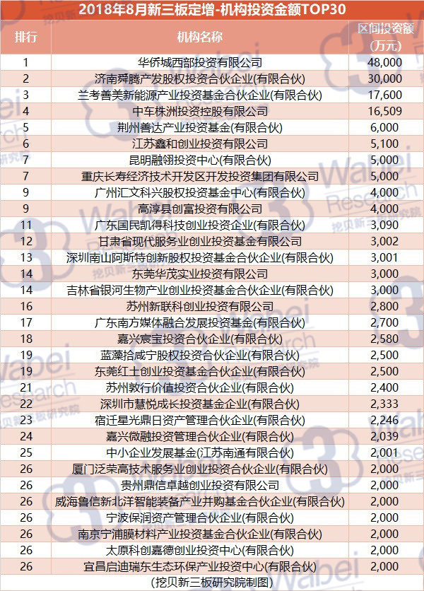 挖貝新三板研究院最新出爐的《2018年8月新三板定增-機構(gòu)投資報告》顯示,機構(gòu)投資金額最大的為4.80億元,最小的僅為50.79萬元?!?018年8月新三板定增-機構(gòu)投資金額TOP30》的上榜門檻為投資2000萬元。