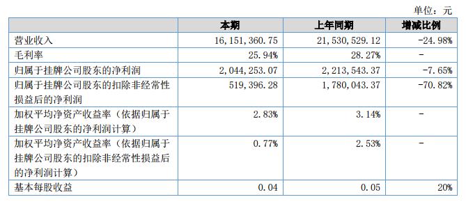 報(bào)告期內(nèi),公司實(shí)現(xiàn)營業(yè)總收入16,151,360.75元,同比下降5,379,168.37元,下降幅度24.98%,其中機(jī)械類營業(yè)收入10,928,449.31元,相比去年減少4,048,106.11元;冷鏈類營業(yè)收入5,209,334.61元,相比去年減少1,344,639.06元。營業(yè)總成本15,441,684.76元,同比下降4,129,769.02元,下降幅度21.10%。凈利潤2,044,253.07元,同比下降169,290.30元,下降比例7.65%。經(jīng)營活動(dòng)產(chǎn)生的現(xiàn)金流量凈額-1,594,818.53元,同比下降4,030,512.06元,下降比例165.48%。?