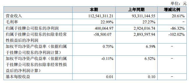 報告期內(nèi),公司總資產(chǎn)為195,281,673.40元,比上年期末增長6.04%;歸屬于掛牌公司股東的凈資產(chǎn)為53,362,330.54元,比上年期末增長0.86%;公司本年度實(shí)現(xiàn)營業(yè)收入112,541,311.21元,比上年同期增長20.61%;實(shí)現(xiàn)歸屬于掛牌公司股東的凈利潤400,064.97元,比上年同期下降86.32%。