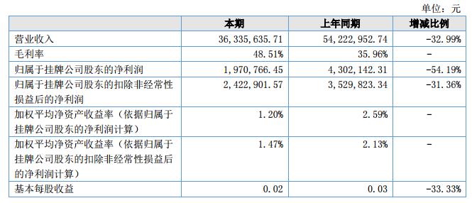 報(bào)告期內(nèi),公司實(shí)現(xiàn)營(yíng)業(yè)收入36,335,635.71元,同比下降32.99%;報(bào)告期內(nèi)公司實(shí)現(xiàn)凈利潤(rùn)1,930,699.62元,同比下降54.67%。?