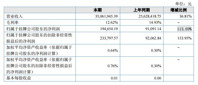 報(bào)告期內(nèi)公司營(yíng)業(yè)收入35,061,945.39元,同比增長(zhǎng)36.81%,營(yíng)業(yè)成本30,637,124.17元,同比增長(zhǎng)40.52%??鄢墙?jīng)營(yíng)性損益后的凈利潤(rùn)233,797,57元,同比增長(zhǎng)153.95%。?