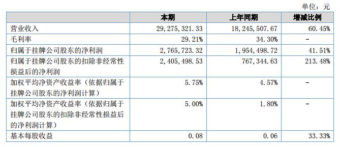 公司在報告期內(nèi)的營業(yè)收入為2,927.53萬元,比上年度同期增長60.45%,營業(yè)成本為2,072.43萬元,比上年同期增長72.89%,歸屬于母公司的凈利潤為276.57萬元,比上年同期增長41.51%。?