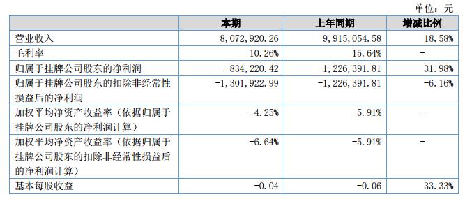 報告期末資產(chǎn)總額23,342,560.37元,較上年期末的24,300,960.41減少3.93%。負(fù)債總額4,150,357.66元,較上年期末的4,267,937.28元減少2.75%。營業(yè)收入8,072,920.26元,比上期減少18.58%。報告期內(nèi)凈利潤為-834,220.42元,經(jīng)營活動產(chǎn)生的現(xiàn)金流量凈額為-2,553,767.27元。?