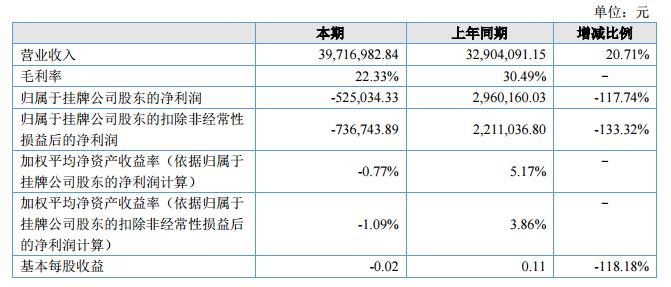 報告期內(nèi),公司整體經(jīng)營情況良好,公司實現(xiàn)銷售收入3,971.70萬元,同比增長20.71%;凈利潤為-123.40萬元,同比減少145.15%。