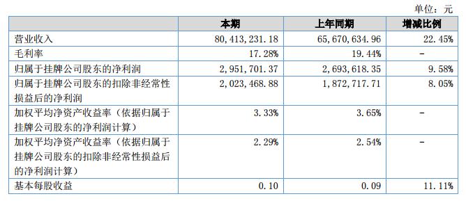 公司2018年1-6月實現(xiàn)營業(yè)收入80,413,231.18元,同比增加14,742,596.22元,增幅22.45%;本期營業(yè)成本66,519,221.94元,同比增加13,612,721.21元,增幅25.73%。歸屬掛牌公司股東凈利潤2,951,701.37元,同比增加258,083.02元,增幅9.58%。?