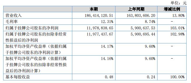 報(bào)告期內(nèi),公司營(yíng)業(yè)收入186,414,120.51元,比上年同期163,803,606.20元增加了22,610,514.31,增幅為13.80%;本期營(yíng)業(yè)收入毛利率為12.31%,較同期增加3.39個(gè)百分點(diǎn);本期實(shí)現(xiàn)歸屬于掛牌公司股東的凈利潤(rùn)11,978,838.65元,較上年同期5,900,637.53元增加6,078,201.12元,增長(zhǎng)103.01%。