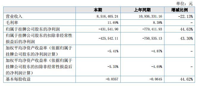 報(bào)告期內(nèi)公司營(yíng)業(yè)收入851.64萬(wàn)元,比上年同期減少22.13%;公司本報(bào)告期凈利潤(rùn)為-43.15萬(wàn)元,比上年同期增加了44.74%。