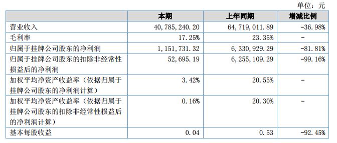 報(bào)告期內(nèi)公司實(shí)現(xiàn)營(yíng)業(yè)收入為40,785,240.20元,較去年同期營(yíng)業(yè)收入下降了23,933,771.69元,下降幅度為36.98%;公司實(shí)現(xiàn)營(yíng)業(yè)利潤(rùn)1,051,146.15元,凈利潤(rùn)為1,151,731.32元,較上年同期分別下降了6,152,157.95元、5,179,197.97元,下降比率分別為85.41%,81.81%。?