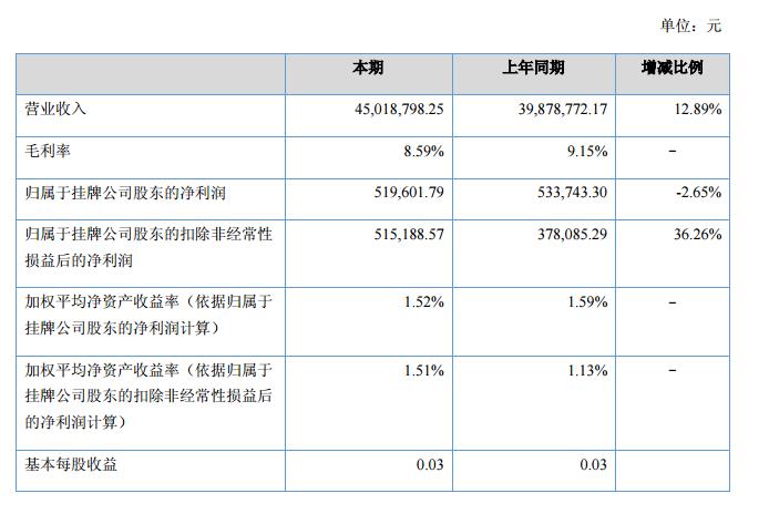 報(bào)告期內(nèi)公司實(shí)現(xiàn)營業(yè)收入45,018,798.25元,上年同期39,878,772.17元,同比上漲12.89%;報(bào)告期實(shí)現(xiàn)凈利潤519,601.79元,上年同期533,743.30元,同比下降2.65%。?