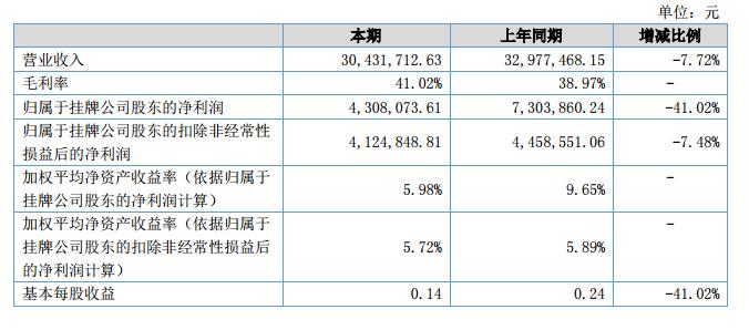 報告期內(nèi)公司實現(xiàn)營業(yè)收入3043萬元,比上年同期的3298萬元減少了255萬元,降幅為7.72%;公司實現(xiàn)凈利潤430.8萬元,比上年同期的730.4萬元減少了299.6萬元,降幅達(dá)到41.02%。?