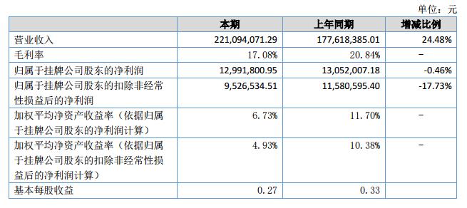 報(bào)告期公司實(shí)現(xiàn)營(yíng)業(yè)收入22,109萬元,比上年同期增長(zhǎng)24.48%;報(bào)告期實(shí)現(xiàn)凈利潤(rùn)1,299萬元,比上年同期下降0.46%。