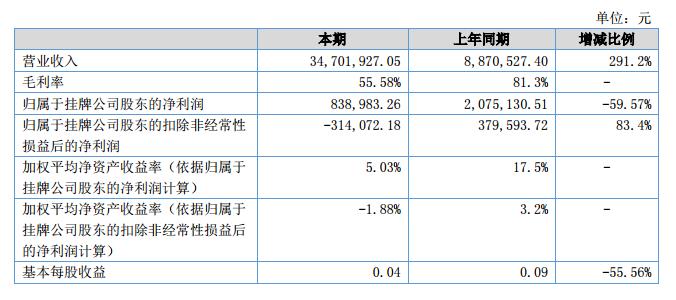 報(bào)告期內(nèi),公司實(shí)現(xiàn)營業(yè)收入34,701,927.05元,同比增長291.20%;利潤總額和凈利潤分別為1,548,437.71元和876,389.44元,同比分別降低了41.71%和56.27%。?
