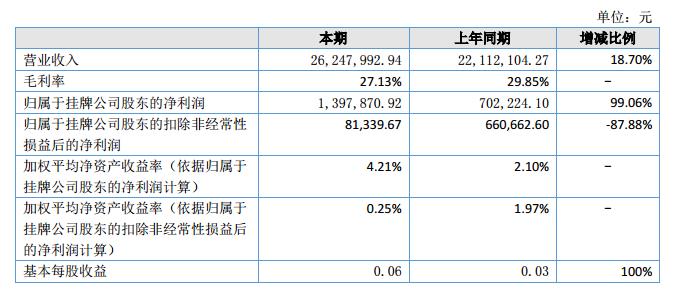 報(bào)告期內(nèi)公司實(shí)現(xiàn)營業(yè)收入26,247,992.94元,較上年同期增加了18.70%;實(shí)現(xiàn)凈利潤1,397,870.92元,較上年同期增加了99.06%。?