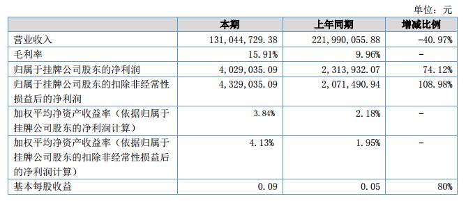報告期內,公司實現(xiàn)營業(yè)收入13,104.47萬元,較上年同期的營業(yè)收入22,199.01萬元減少40.97%、營業(yè)利潤591.28萬元較上年同期372.17萬元增長了58.87%,凈利潤402.90萬元較上年同期205.91萬元增長了95.67%。?