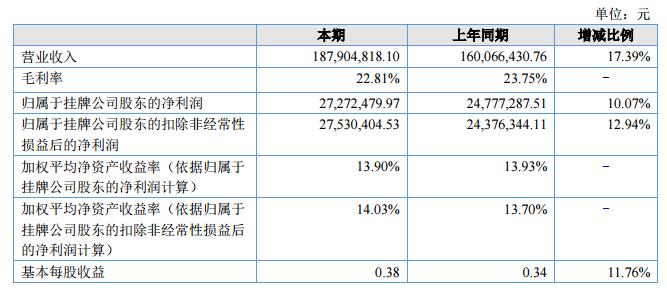 報告期內(nèi),公司共實現(xiàn)營業(yè)收入18,790.48萬元,較上年同期的16,006.64萬元增加了2,783.84萬元,同比增長了17.39%;實現(xiàn)凈利潤2,727.25萬元,較上年同期增加249.52萬元,增長率10.07%。?