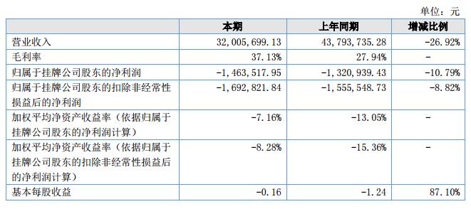 報(bào)告期內(nèi),公司實(shí)現(xiàn)營(yíng)業(yè)收入3,200.57萬(wàn)元,較上期下降26.92%;營(yíng)業(yè)成本2,012.19萬(wàn)元,較上期下降36.24%;凈利潤(rùn)-131.82萬(wàn)元,較上期增加20.81萬(wàn)元。?